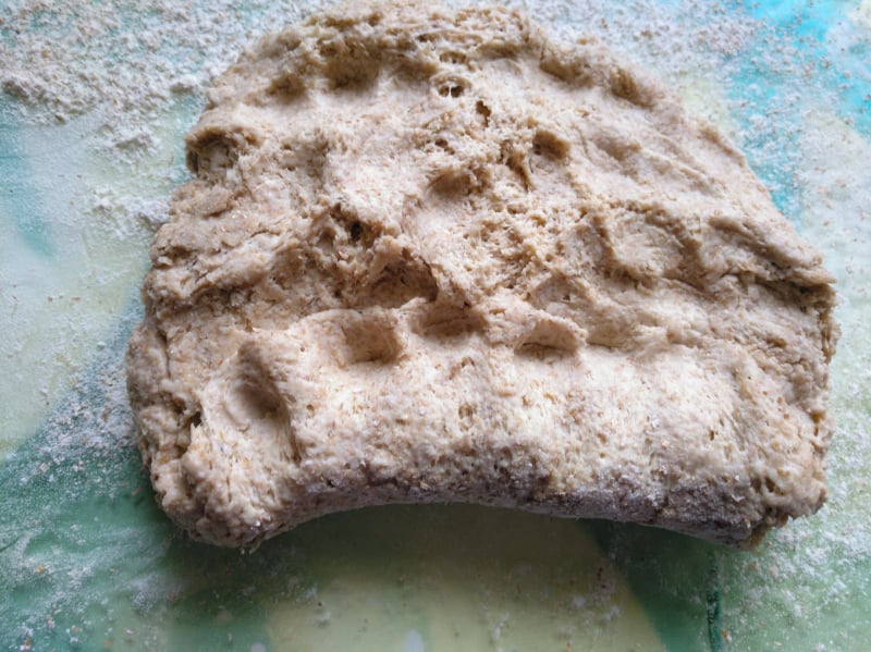 A continuación, añadimos los ingredientes restantes y amasamos, poco, tan solo hasta que se quede todo levemente integrado. Yo he utilizado una cuchara de amasar, por estrenarla, más que nada.
