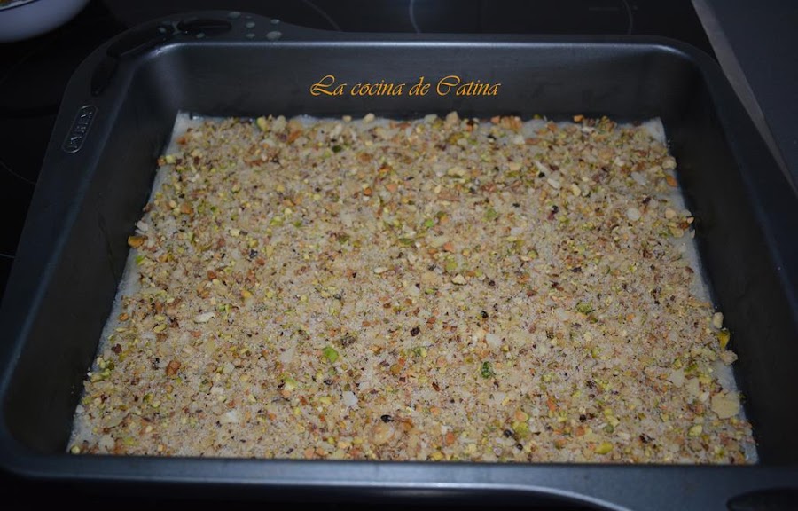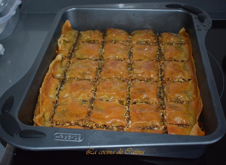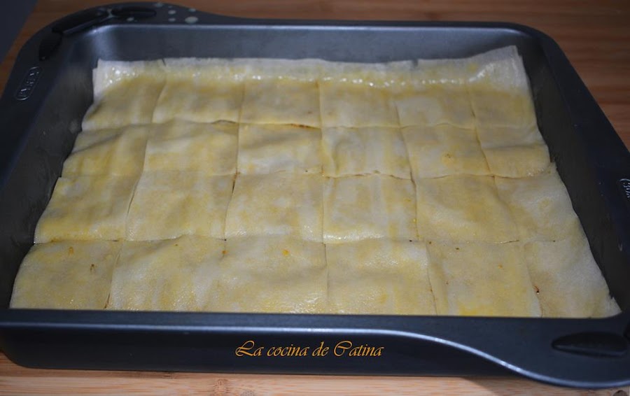 Ponemos encima otra lámina de pasta filo, pintamos con mantequilla y así repetimos hasta tener cuatro capas de pasta filo, la última no hay que pintarla de mantequilla. Echamos la otra mitad de la mezcla de frutos secos y cubrimos de nuevo con cuatro capas de pasta filo pintadas con mantequilla, incluida la última capa. Con un cuchillo bien afilado cortamos en cuadrados o rombos toda la bakclava y horneamos durante media hora.