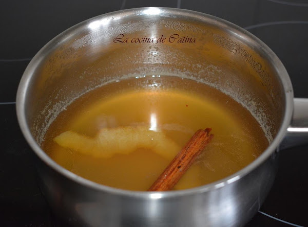 Para hacer el almíbar, ponemos en un cazo el agua, la miel, la corteza de limón, el agua de azahar y el palito de canela, lo ponemos al fuego y cuando empiece a hervir le bajamos el fuego y mantenemos durante 15 minutos, retiramos el palito de canela y reservamos.