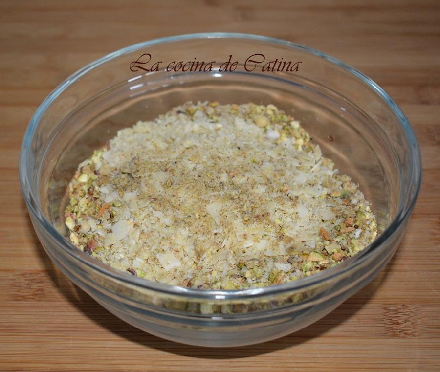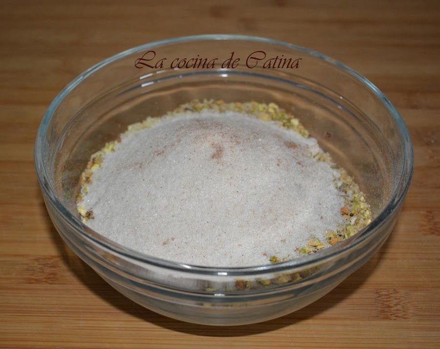 En una picadora ponemos las nueces, los pistachos y las almendras con el azúcar y trituramos bastante para que quede bien picado. Lo pasamos a un bol y le añadimos la canela y el cardamomo, mezclamos bien y reservamos.