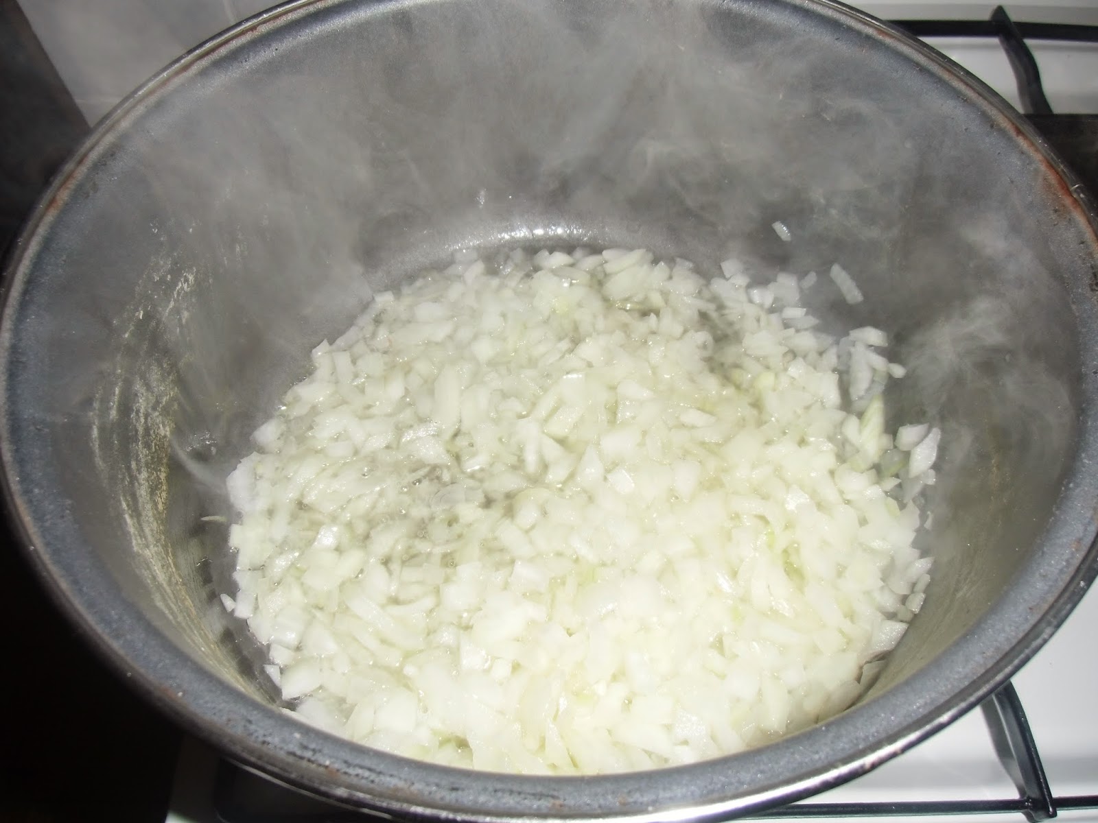 Por otro lado, en una cazuela con un poco de aceite de oliva cocinamos las cebollas y los ajos finamente picados hasta que tomen color, salpimentamos.