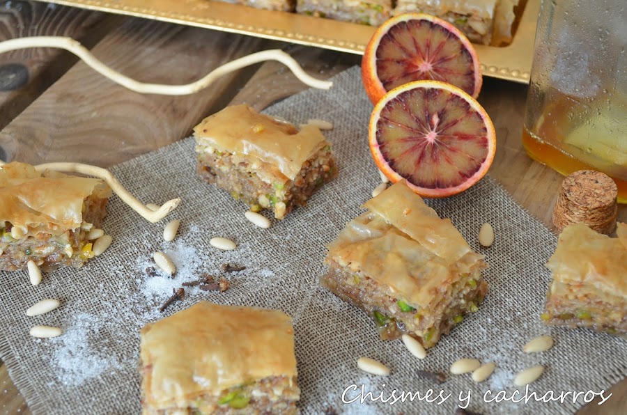 Ahora se hacen baklavas con distintos frutos secos pero en realidad el baklava se hacía con una pasta de nueces trituradas, entre capas de masa filo y bañado por un álmibar o jarabe de miel. En mi caso he usado, avellanas, pistachos, nueces pecanas y piñones, un poco de todo..