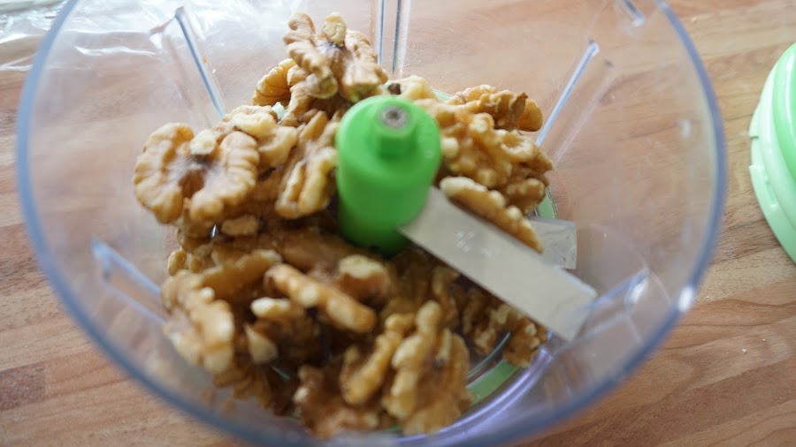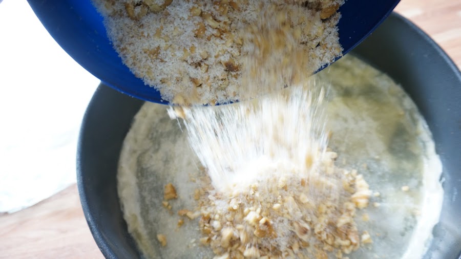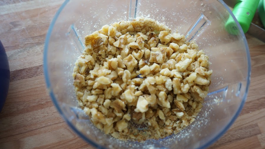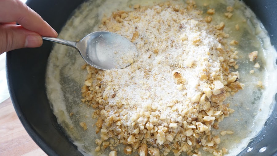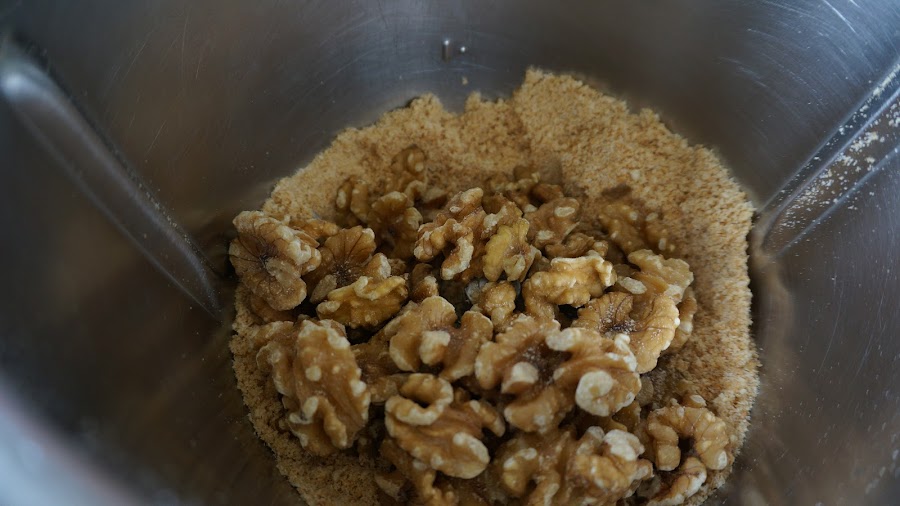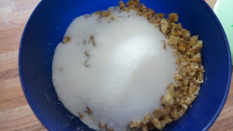 Primero trocea las nueces que queden un poco gruesitas para que se noten y las mezclas con el azúcar