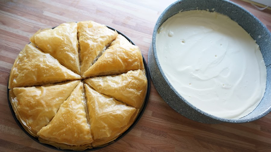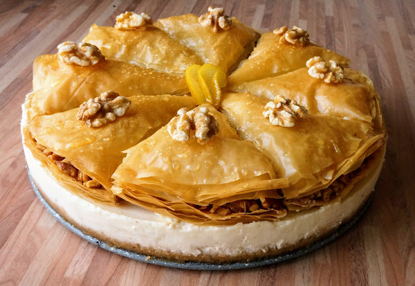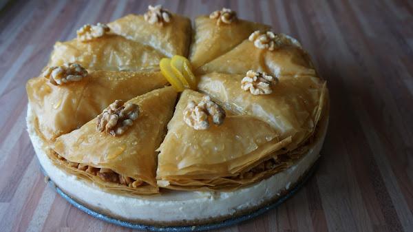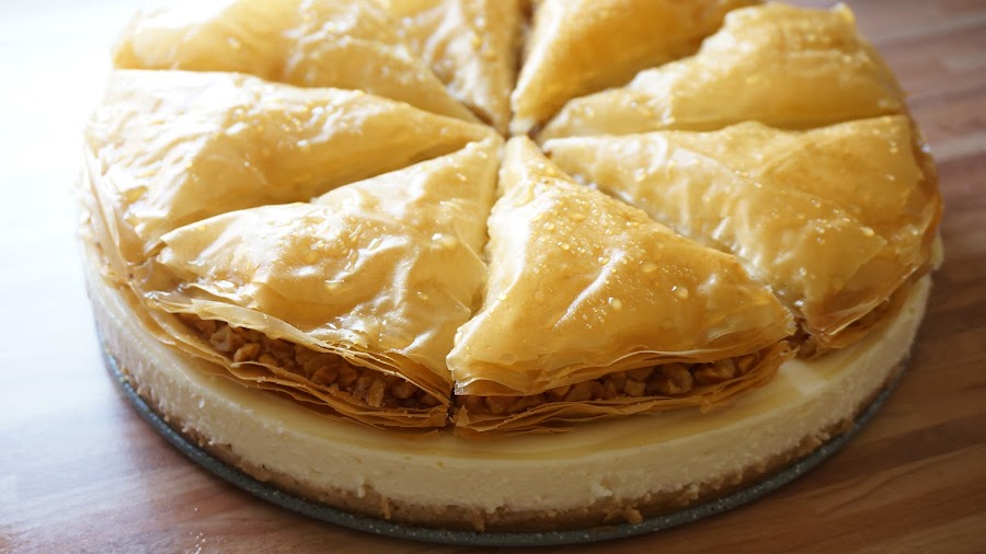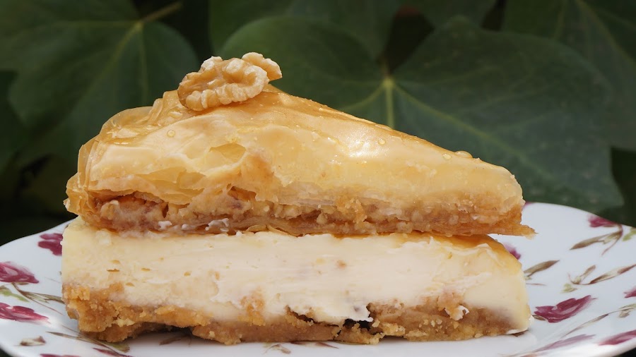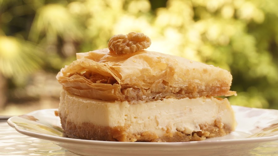 Este delicioso postre está formado por 2 capas, la de abajo por un cheesecake aterciopelado, y por encima por un baklava de nuez.