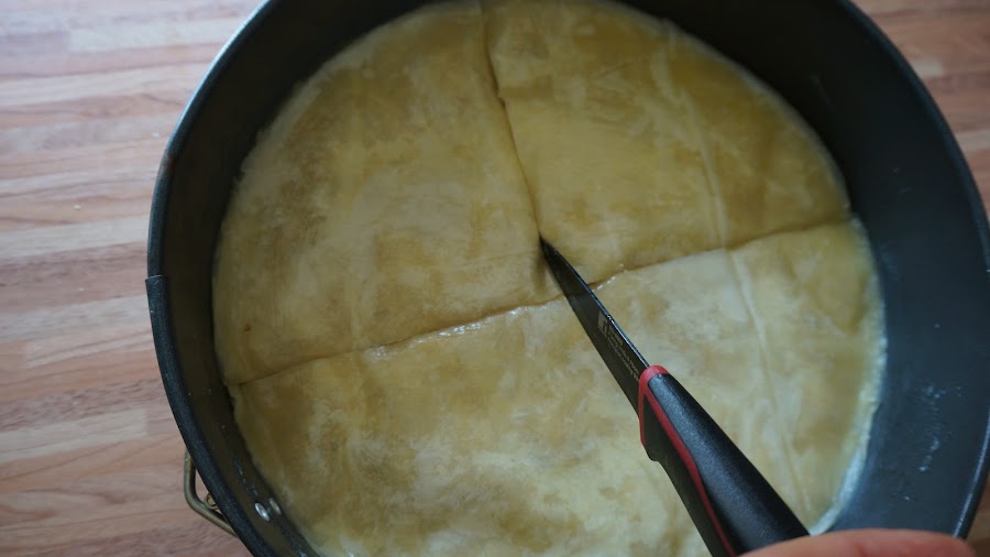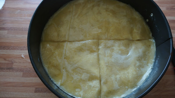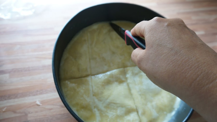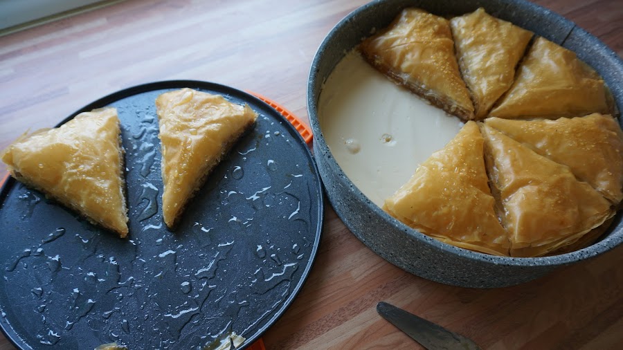 Vamos colocando las porciones de baklava sobre el cheesecake. Si eres muy habilidoso, podrás colocar todo en baklava de una sola pieza sobre el cheesecake, yo no me quise arriesgar.