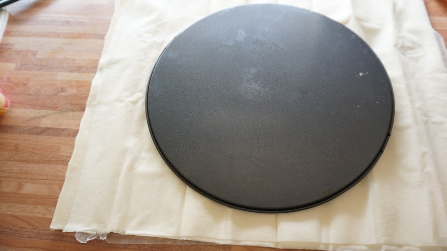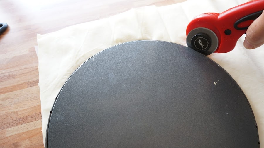Si te das cuenta, al cortar por fuera del molde, las hojas quedan mas grandes que el molde y sobra un poquito, eso está bien porque en la cocción encoje la masa al inflarse.