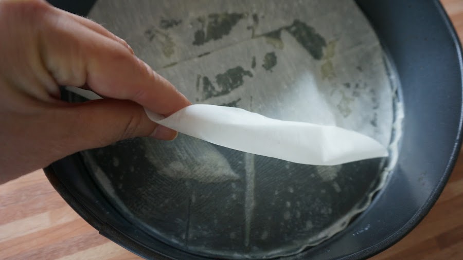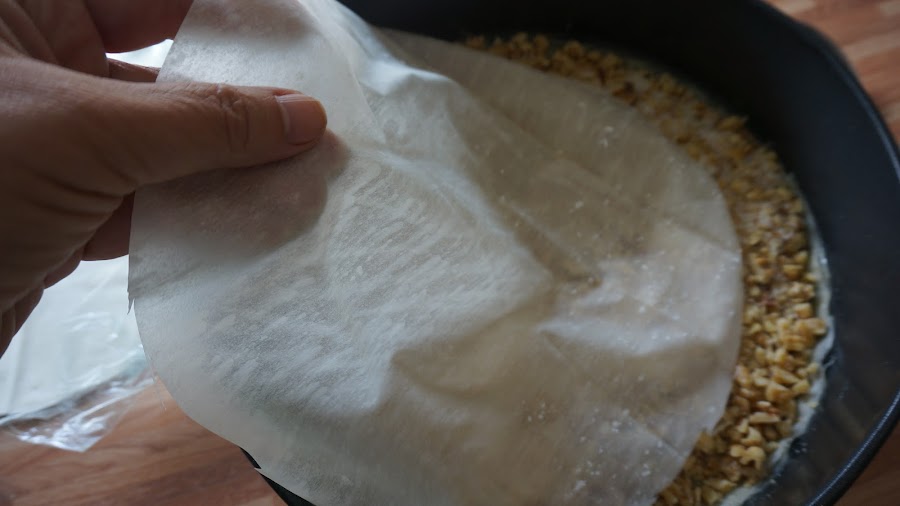 Sin perder nada de tiempo, envuelve las hojas de masa en papel film, porque son muy delicadas y se secan muy rápido y se pueden romper. En todo momento, deben quedar cubiertas, aún en el armado del baklava, debes tener en cuenta este detalle, que no queden al aire.