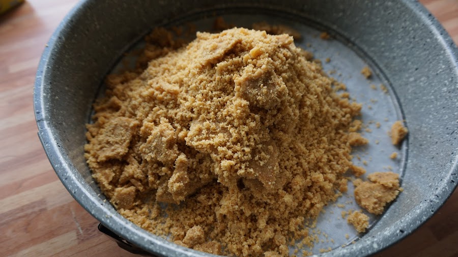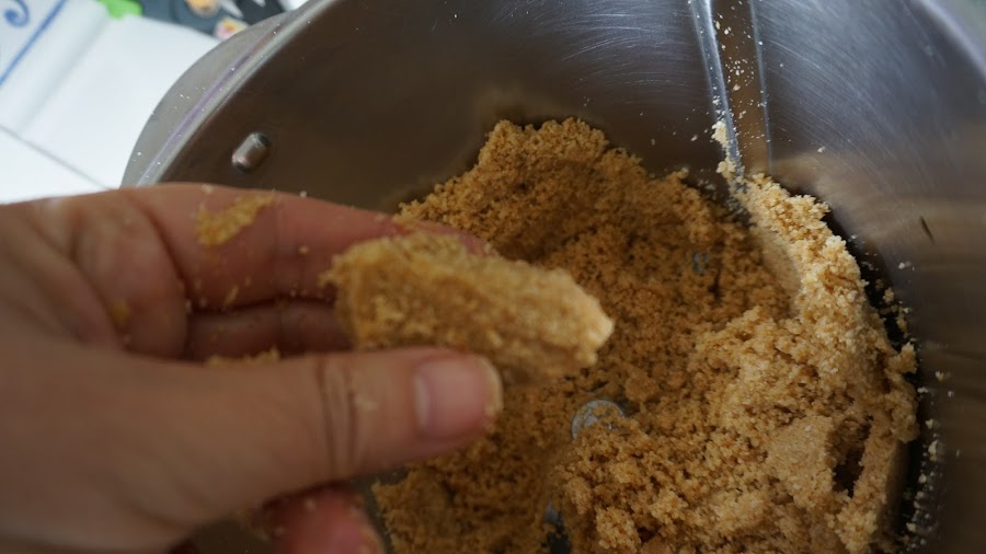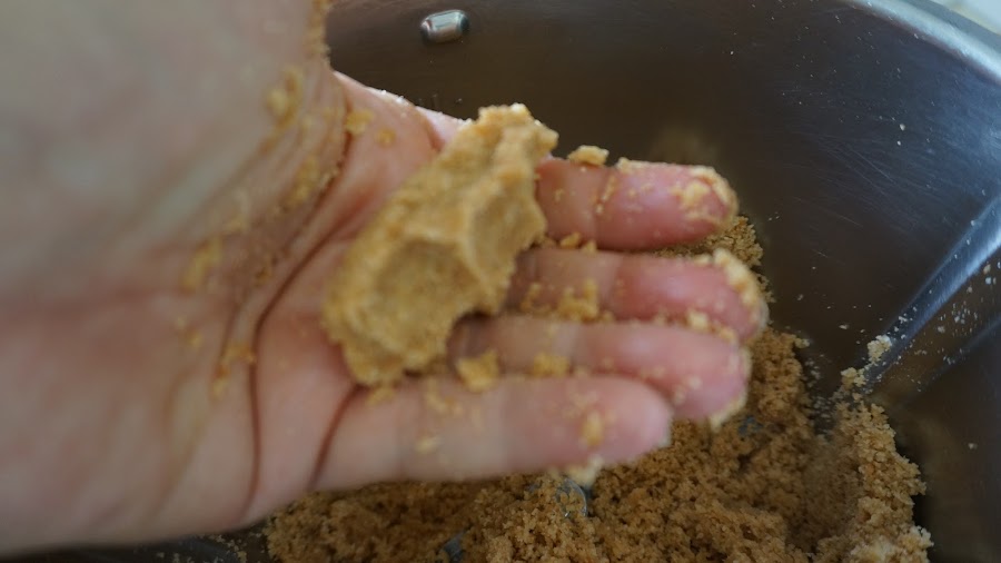 La cantidad de mantequilla derretida es orientativa. Tienes que lograr que tomas una porción de esa pasta y la aprietas, hasta que se convierta en algo denso. Si se desmorona, agrega un poco mas de mantequilla derretida
