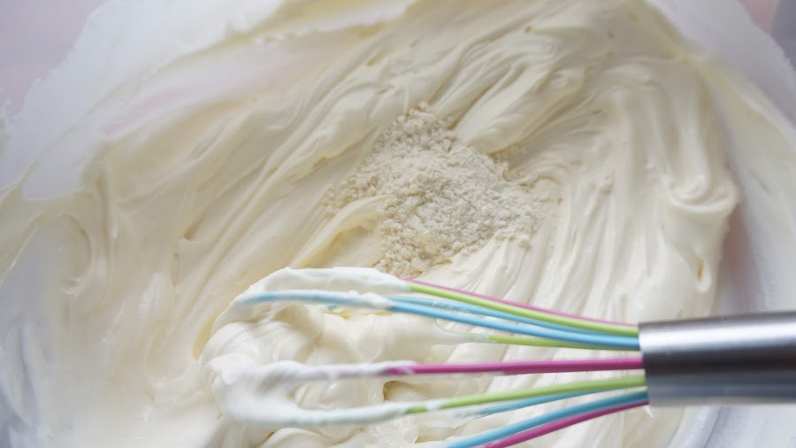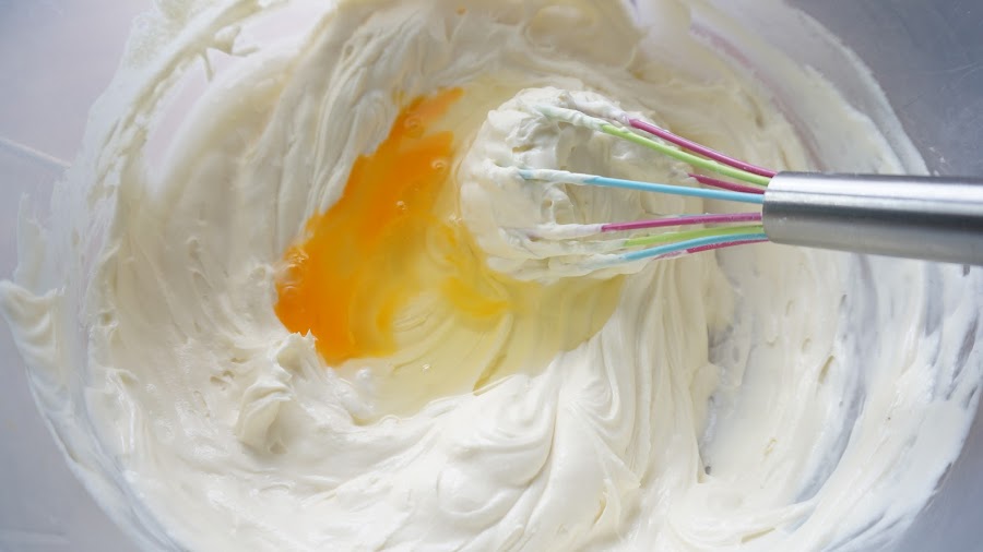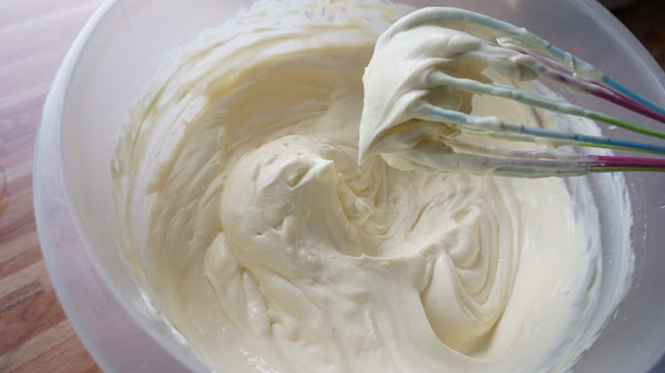 Mezcla el queso, con la crema y el azúcar, la esencia y bate hasta que quede cremoso