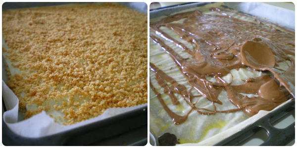 Disponer 1 hoja de pasta filo y con ayuda de un pincel, embadurnarla ligeramente con la margarina líquida. Poner otra hoja encima y volver a embadurnar y luego otra más. He usado tandas de 3 láminas alternadas entre las capas de almendras, nutella y chocolate.
