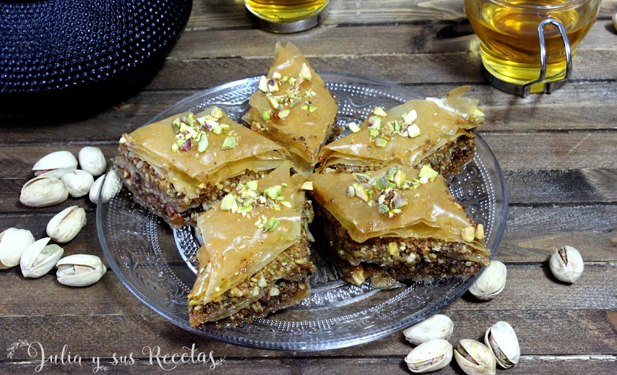 Actualmente se elabora con capas de masa filo intercalada entre nueces y pistachos triturados y bañada con un almíbar de miel agua y canela.