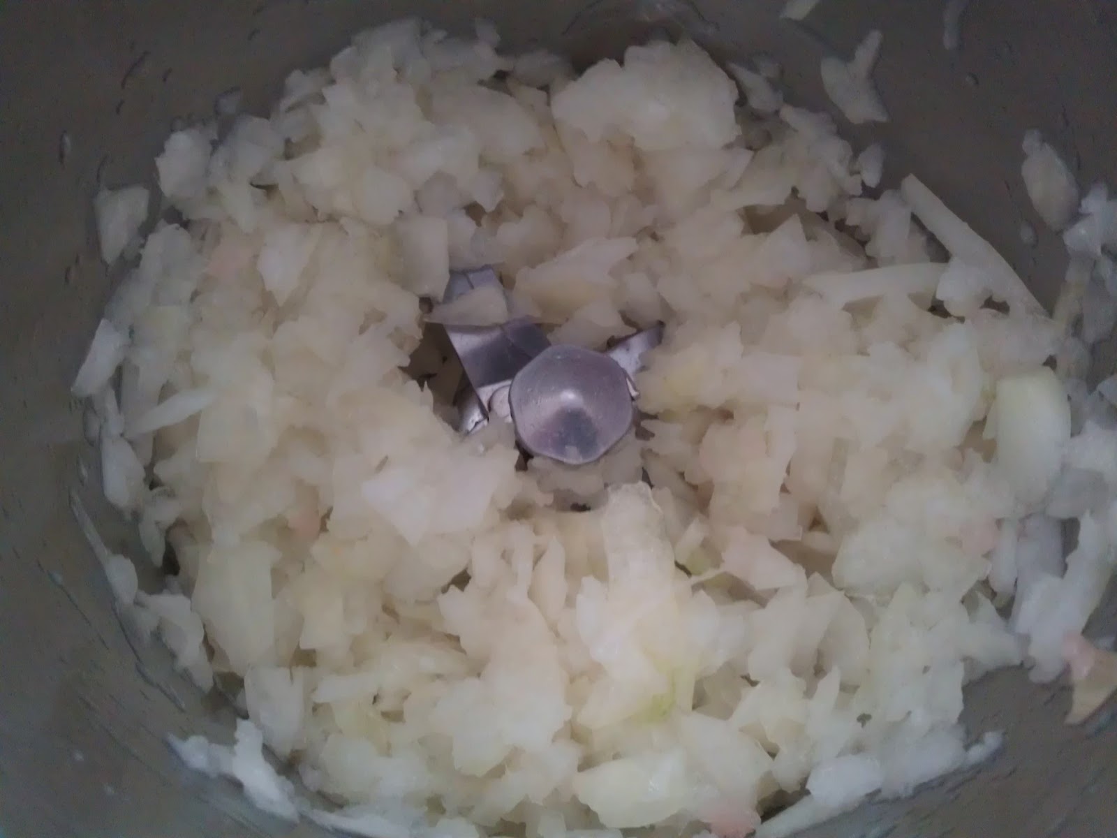 3. - Echar en el vaso la cebolla partida en cuartos 4 segundos a velocidad 4, añadir el aceite y programar 10 m minutos, temperatura varoma, velocidad 1.