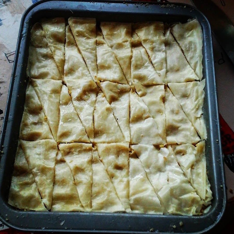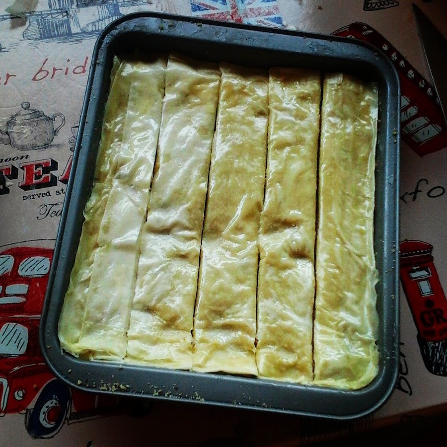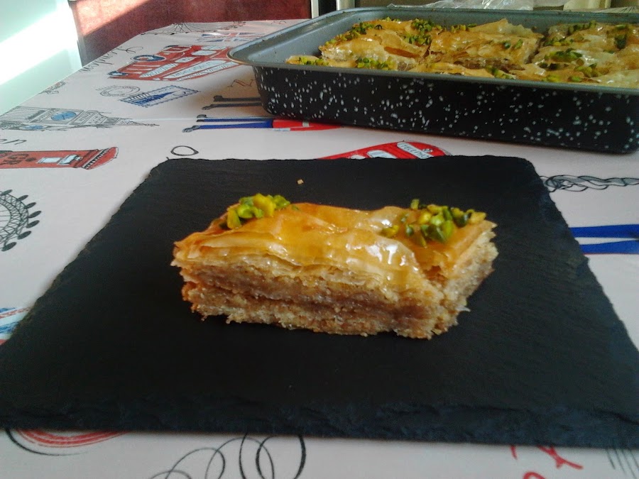 Cuando el baklava esté dorado lo sacamos del horno y vertemos el almíbar.