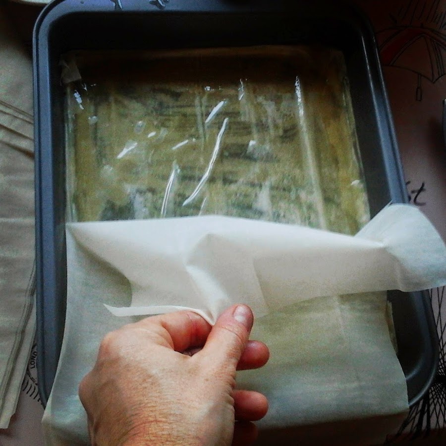pincelando una fuente con la mantequilla fundida.Colocamos una lámina de filo de la medida de la fuente y seguimos pincelando. Repetimos este paso hasta hacer cuatro hojas de filo.