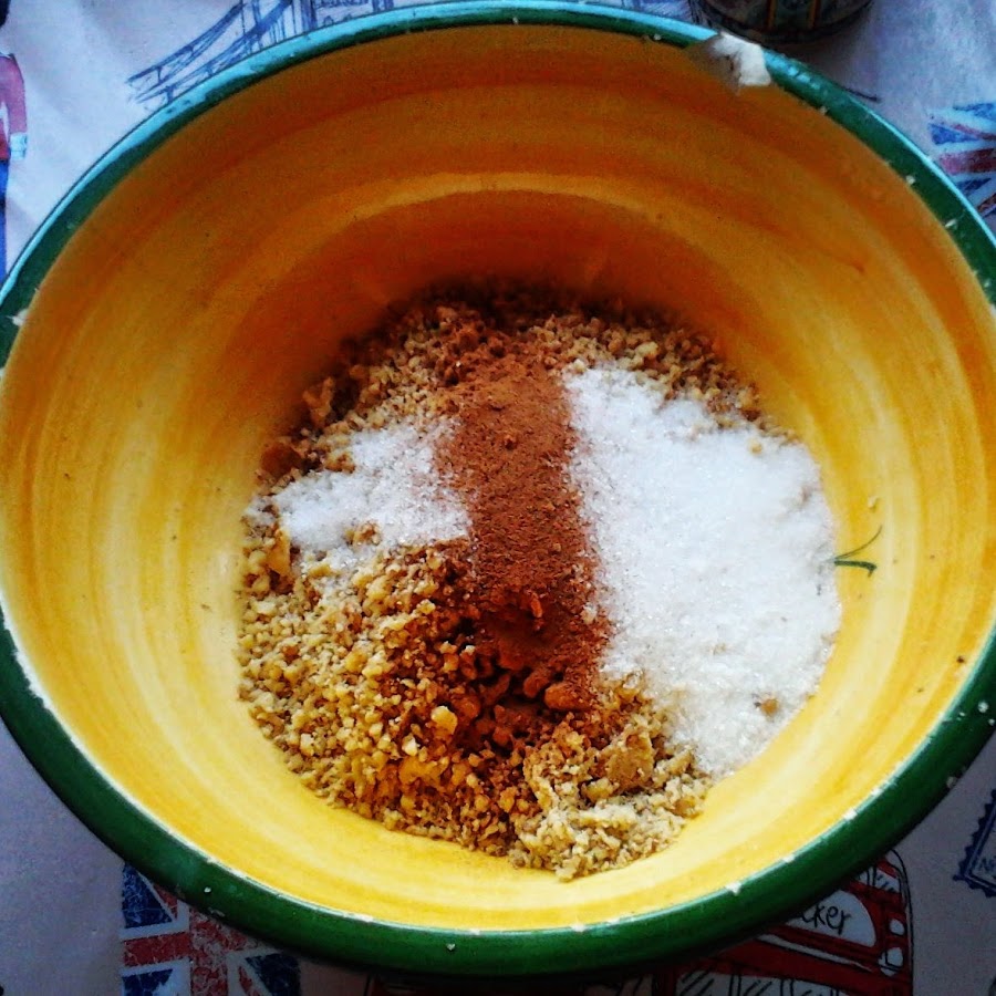En primer lugar mezclamos las nueces muy picaditas con el azúcar y la canela.