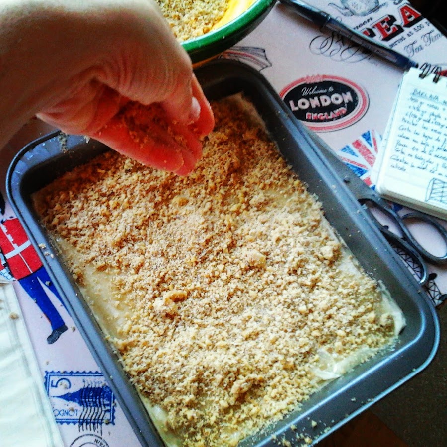 Seguimos con otras cuatro hojas de filo pinceladas con mantequilla fundida ( si la mantequilla se nos va quedando fría iremos calentándola en el micro). Otra parte de nueces, y así hasta hacer cinco capas de filo y cuatro de nueces.