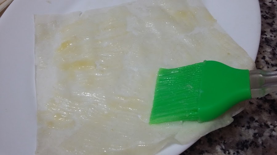 4- Coger los cuadritos de pasta filo de dos en dos, pintar con la mantequilla derretida y espolvorear