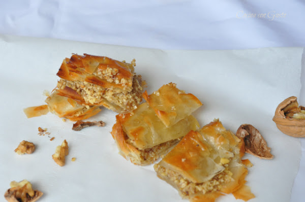 Un dulce típicamente turco elaborado con pasta de nueces, sobre pasta filo y endulzado con una almíbar o jarabe de miel. Es muy agradable al gusto y aunque a priori parezca muy dulce, el contraste con las nueces hace que sea agradable de comer. Cierto es que yo en el relleno no añadí azúcar, que si suele llevar, pero pensé que con el almíbar era suficiente. Para mi gusto, perfecto.