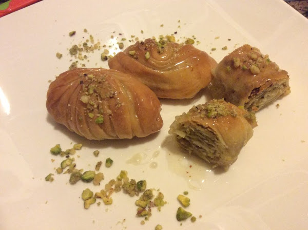 Como se observa en la foto, he hecho también otro modelo de baklava. Para montar estos, debemos cortar la masa en diagonal. Después, tomar uno de los trozos y calcular más o menos la mitad del lado que cortamos y con un dedo arrugarlo hacia afuera. Se formará una especie de lazo que tenemos que juntar, luego, ponemos el relleno y doblamos por los lados y por abajo para que no se salga. Enroscamos y formamos un paquetito.