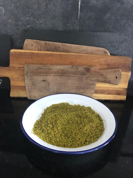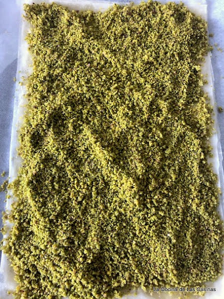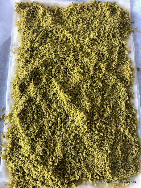 Pica los pistachos en tu máquina. Vierte un poco del almíbar que se está formando encima de la capa de pistachos. Cubre con el resto de mitades de la masa philo, pinceladas con la mantequilla diluida.