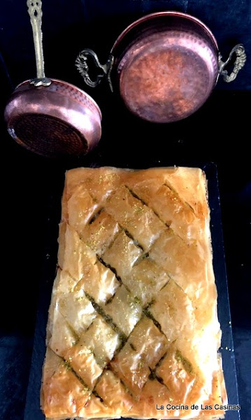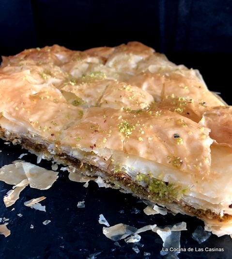 Es un maravilloso postre que harás y repetirás mil veces. Si tienes problemas para comprar la pasta philo puedes hacerlo con una plancha de hojaldre como te conté hace mucho aquí. Sirve en porciones romboides.