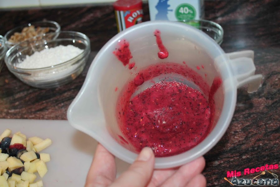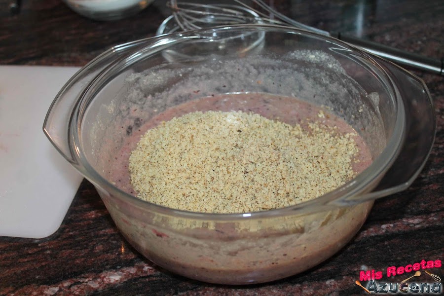 En un bol pondremos los huevos junto con los dos azucares, con ayuda de unas varillas mezclaremos, una vez tengamos todo bien mezclado añadiremos la fruta batida y la mantequilla derretida, seguiremos mezclando para poder añadir las nueces picadas.