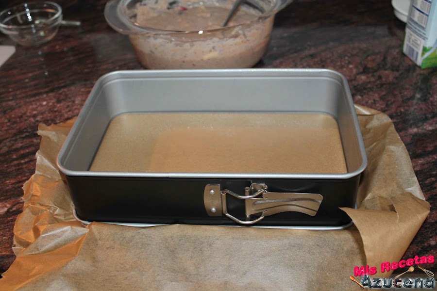 Ahora cogeremos nuestro molde y le pondremos papel vegetal en la base y spray desmoldante por los lados, si no tenemos spray lo podemos hacer como siempre untando mantequilla y espolvoreando un poco de harina, el monde que yo he utilizado es de 28x19, una vez lo tengamos listo pondremos la masa, le daremos unos golpecitos para que se nivele la masa y lo metemos en el horno y lo dejaremos entre 30 y 35 minutos.