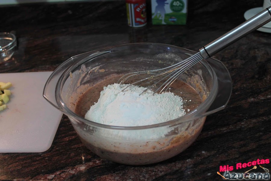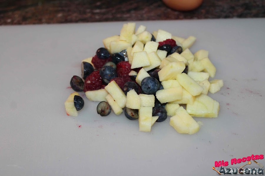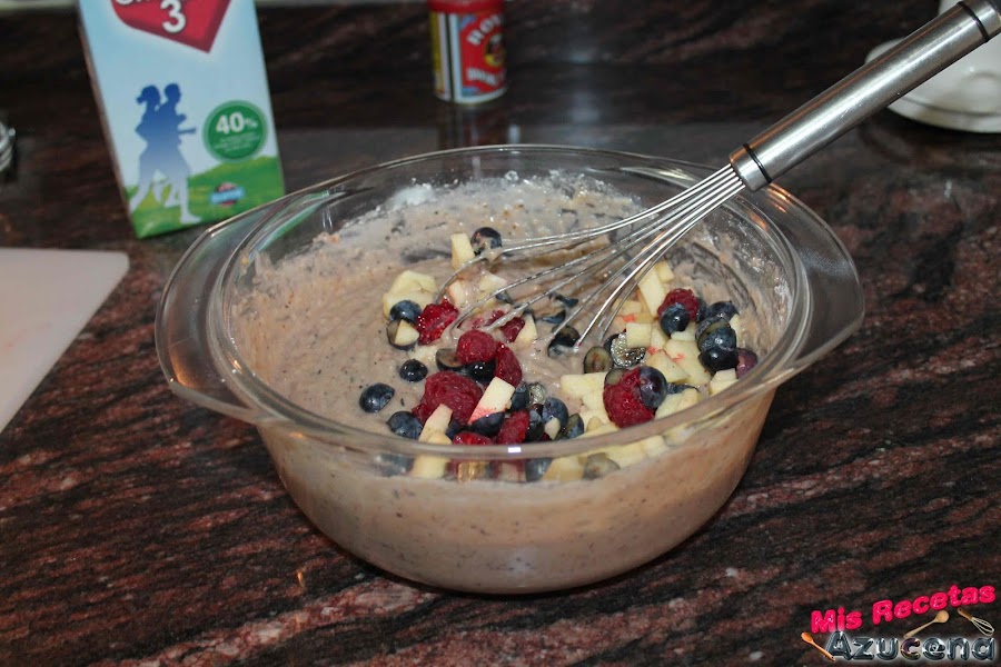 Una vez tengamos todo bien mezclado añadiremos las dos cucharadas soperas de leche, la harina tamizada junto con la levadura, volvemos a mezclar y cunado este todo bien unido añadiremos la fruta que teníamos reservada, ahora con cuidado de no romper mucho la fruta mezclamos un poco más.