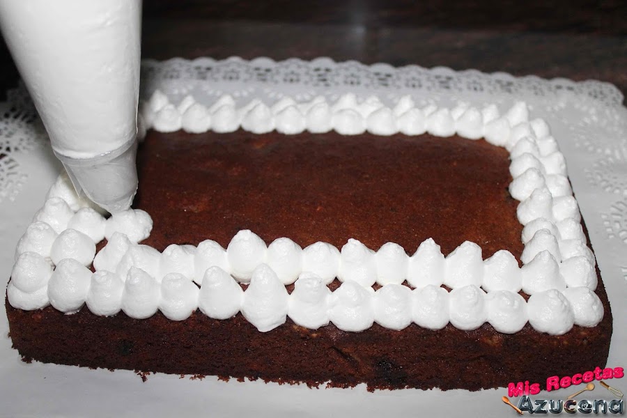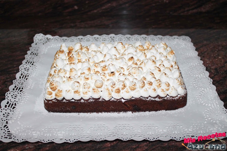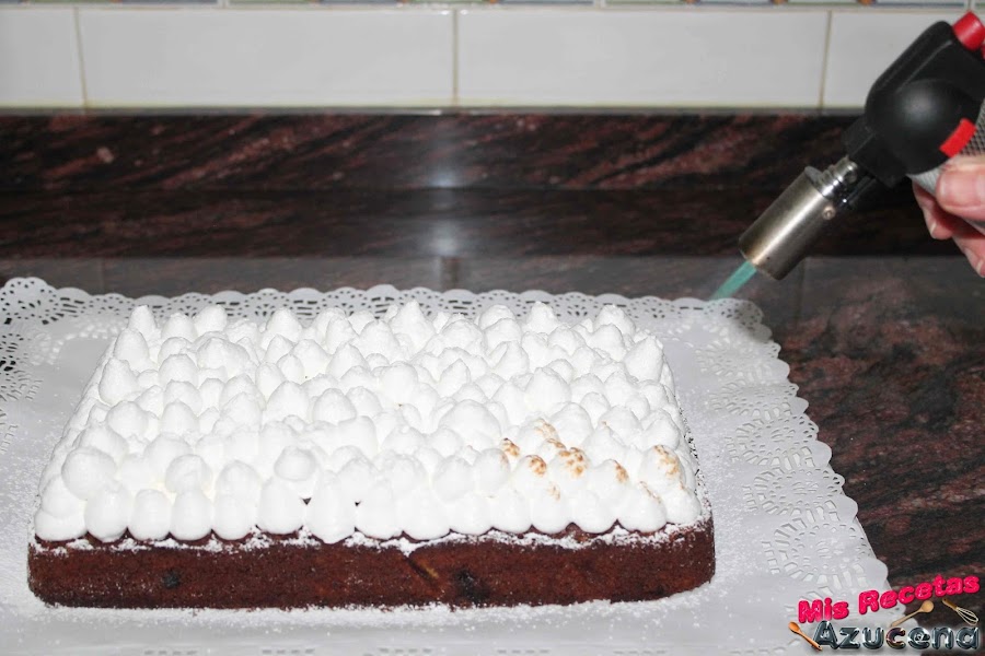 Una vez tengamos el bizcocho listo cogeremos una manga pastelera con una boquilla redonda y la rellenaremos de merengue para hacer picos sobre el bizcocho, cuando tengamos toda la parte superior lista espolvorearemos un poco de azúcar glass y con ayuda de un soplete quemaremos un poco el merengue.