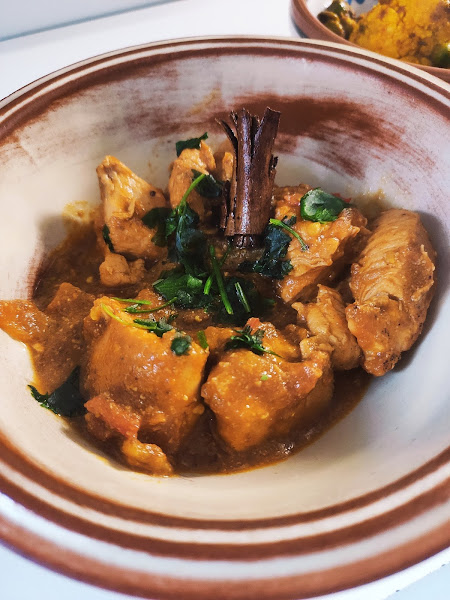Cortamos el pollo en trozos y lo añadimos a la sartén. Subimos el fuego, freímos unos minutos y después añadimos la pasta que tenemos en el mortero. Cocinamos 2 minutos más, añadimos las restantes especias y mezclamos bien.