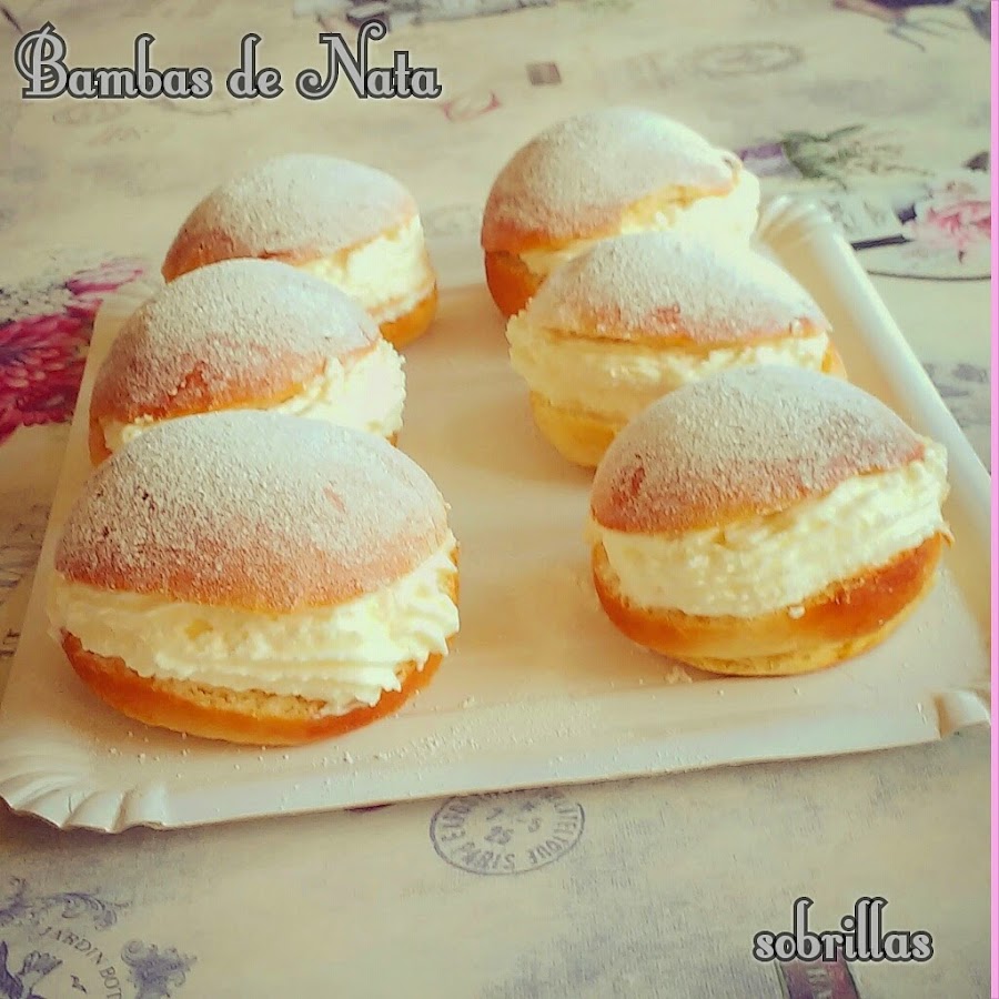 Abrimos los bollos y los rellenamos abundantemente con la nata (crema de leche). Espolvoreamos con azúcar glas.