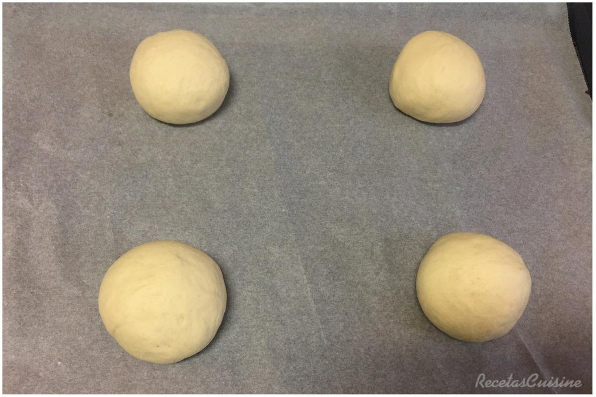 6. Pasado este tiempo, sacamos la masa del bol y la volcamos sobre nuestra superficie de trabajo. Con las manos, presionamos ligeramente para que salga el aire que se ha creado durante la fermentación. Dividimos en 4 partes iguales, boleamos y dejamos en la bandeja del horno, sobre papel de hornear y con separación para que al creceré no se junten. Metemos la bandeja en el horno apagado y dejamos que fermente durante 60-90 minutos aprox. hasta que veamos que aumentan considerablemente de tamaño.
