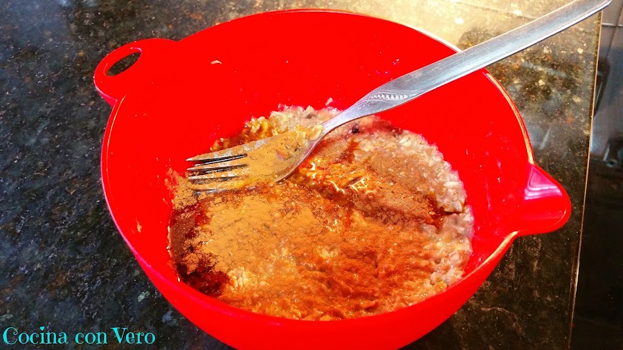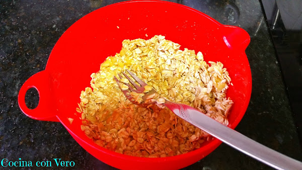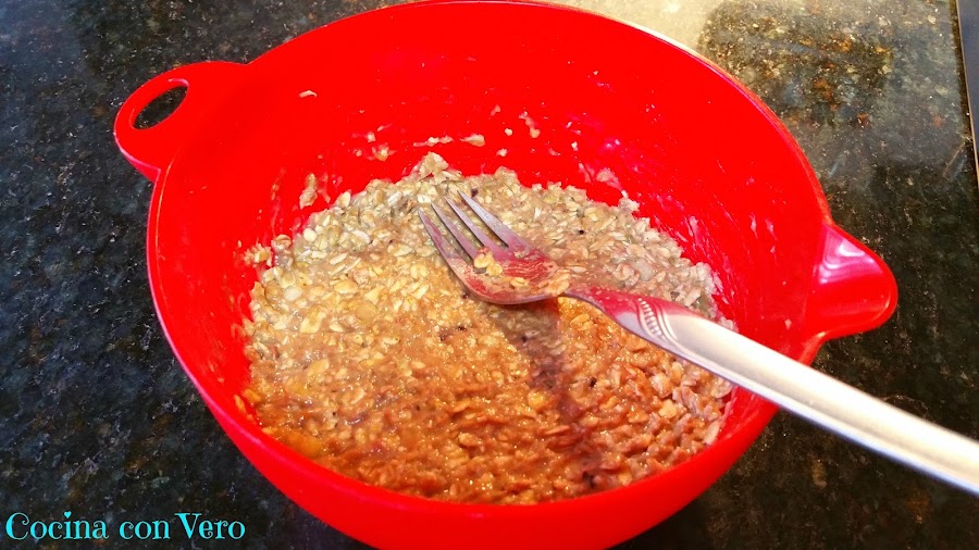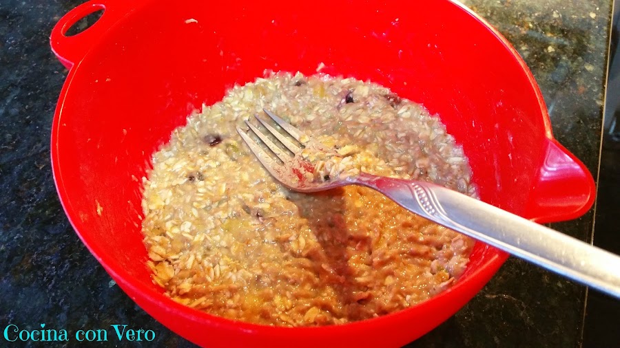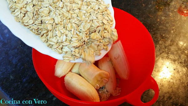 1/ En un bol ponemos los 3 plátanos ya pelados y cortados por la mitad junto con la avena y lo vamos a ir aplastando con la ayuda de un tenedor hasta obtener una pasta homogénea.
