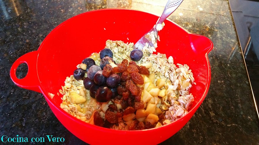 2/ Añadimos al bol los arándanos, la manzana, las pasas, un poco de canela lo que es espolvorear un poco por encima y esencia de vainilla como una cucharadita pequeña de postre. Mezclamos todo muy bien aplastándolo con el tenedor.