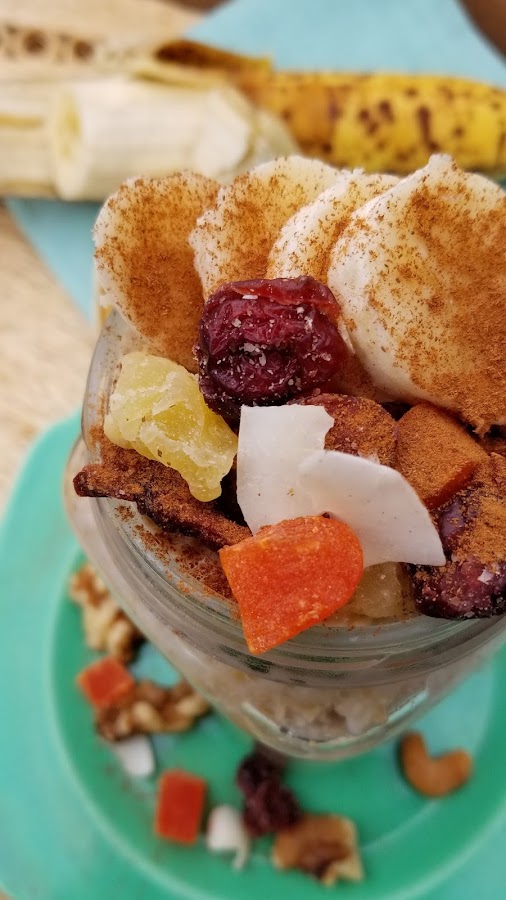-Decorar con un poco de plátano en rodajas y frutas secas. Espolvorear con canela molida.