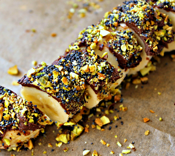 Esparce los pistachos en un plato llano y pasa la banana por el lado de la Nutella por encima para que se "reboce" en los pistachos.