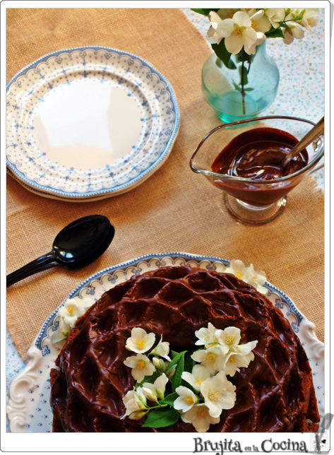 Para el baño, derretimos todos los ingredientes juntos al baño maría, dejamos atemperar y vertemos sobre el bizcocho ya frio.
