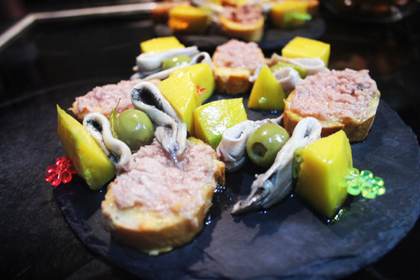 Insertamos en un palillo un trozo de mango, un lomo de boquerón dobladito, una aceituna otro lomo de boquerón y terminamos con otro dadito de mango.