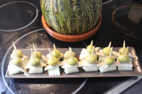 Colocamos las mitades de lomos de boquerón sobre los daditos de melón y los unimos con el palillo con la aceituna insertada.
