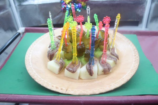 Troceamos el medio pepino (pelado) y también con la ayuda de palillos, unimos a cada trocito de pepino, una aceituna rellena y un trocito de pepinillo en vinagre.