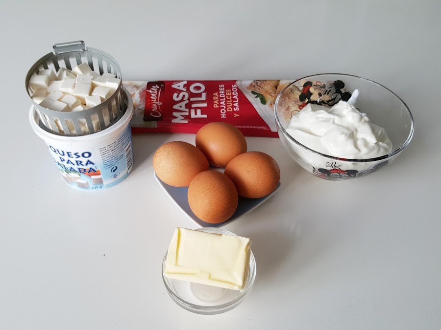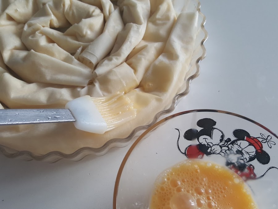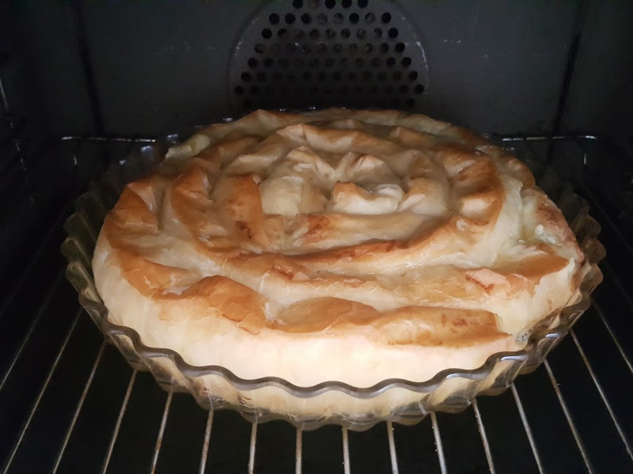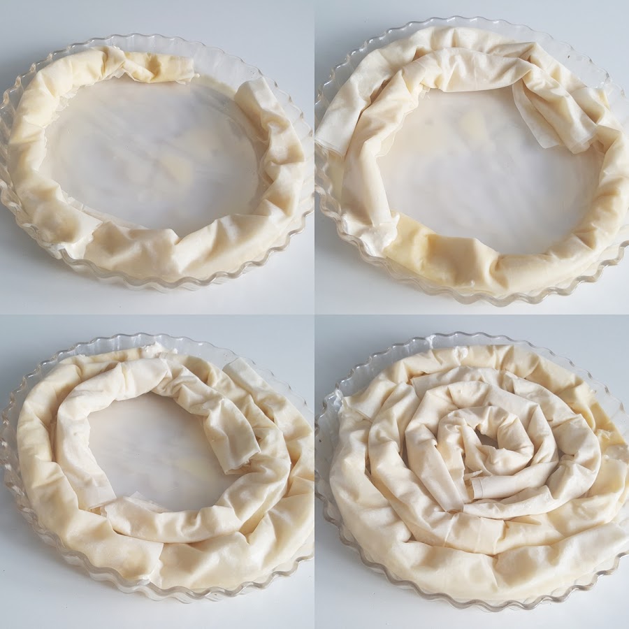 Si bien ella lo hacía en plan lasaña intercalando capas de pasta filo con relleno, y luego ya horneado lo cortaba como una empanada, luego lo he visto con forma de ensaimada, y me ha gustado más la presentación, pero vamos, que el resultado es igual de bueno.