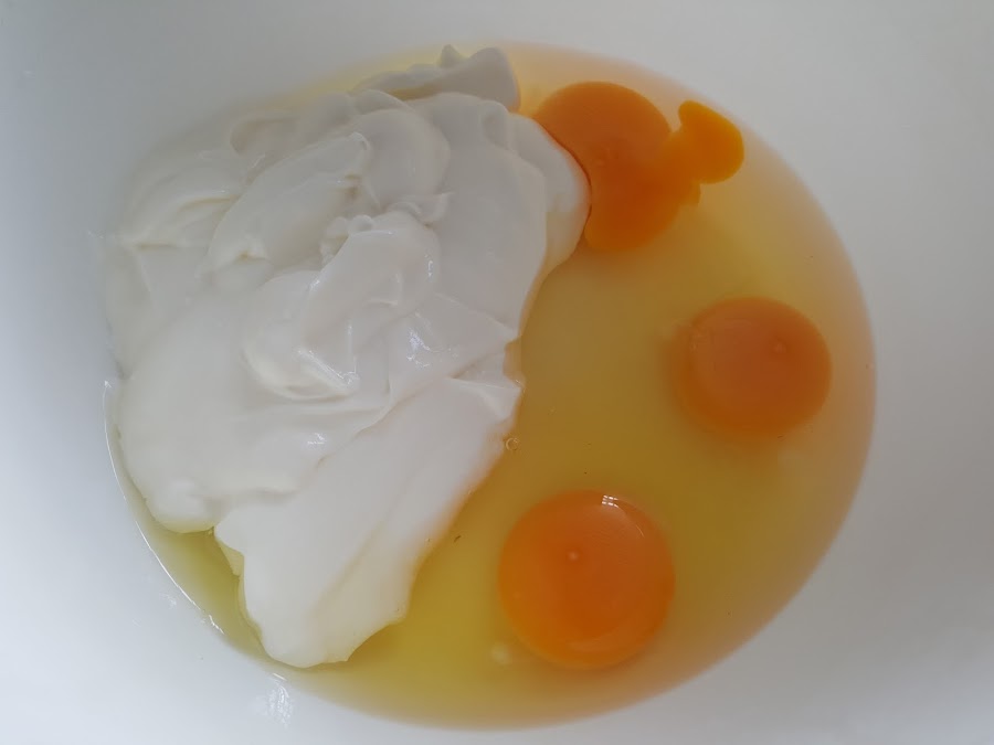 2. - En un bol ponemos 3 huevos y los yogures y los batimos.