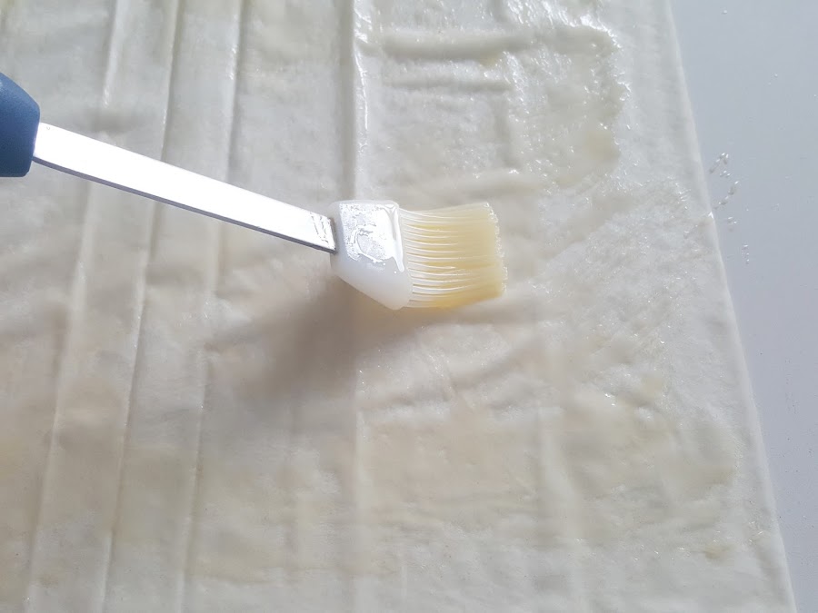 5. - Cogemos una hoja de pasta filo, la pintamos con mantequilla derretida por toda la superficie.