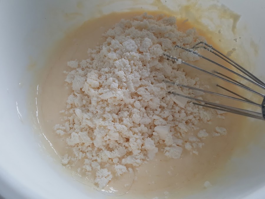 3. - Le añadimos el queso desmenuzado, y mezclamos bien y ya tenemos el relleno.