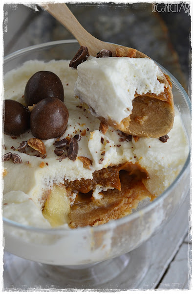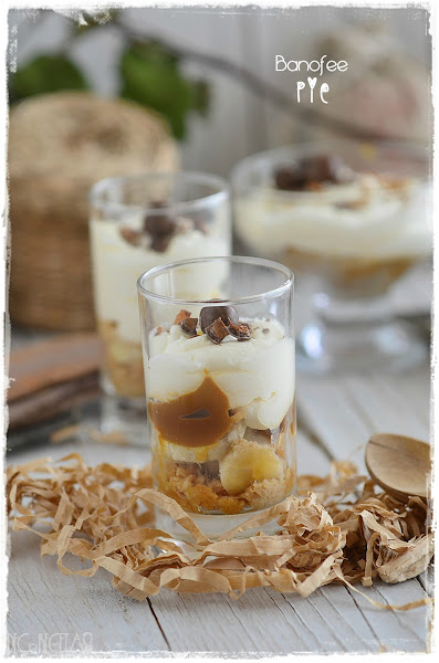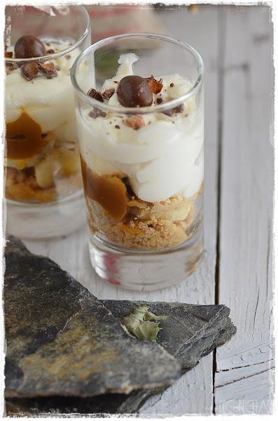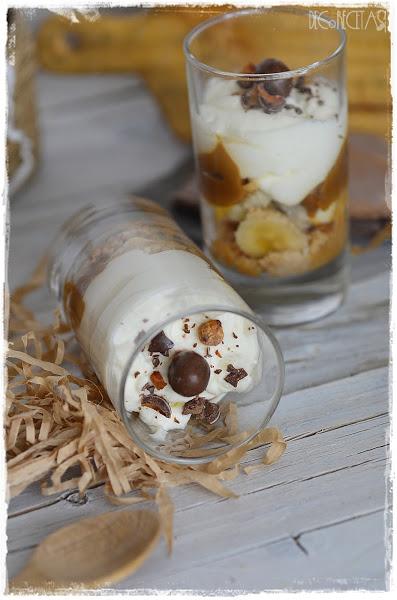 Machacamos las galletas y las mezclamos con la mantequilla derretida hasta formar un masa compacta que disponemos en el fondo del vaso. Encima, colocamos unas rodajas de plátano, el dulce de leche, la nata montada (crema de leche), y para culminar en mi caso, una cacahuetes cubiertos de chocolate y troceados.