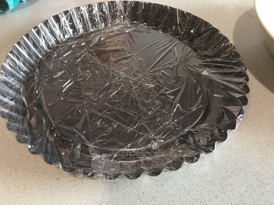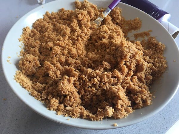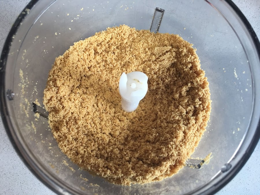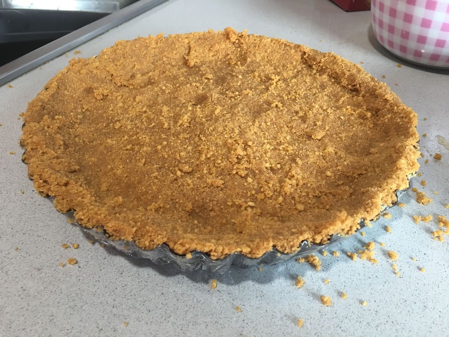 1. Trituramos las galletas digestive. Para evitar que la tarta resulte empalagosa es muy importante escoger un tipo de galleta que contenga un toque salado, las de tipo digestive resultan ideales. Derretimos los 125g de mantequilla, puede ser neutra o al punto de sal, que también queda muy bien. Mezclamos las galletas con la mantequilla y ponemos la mezcla en molde presionando bien. Para evitar que se pegue la base en el molde lo cubrimos con papel film. Lo llevamos a la nevera un mínimo de una hora.