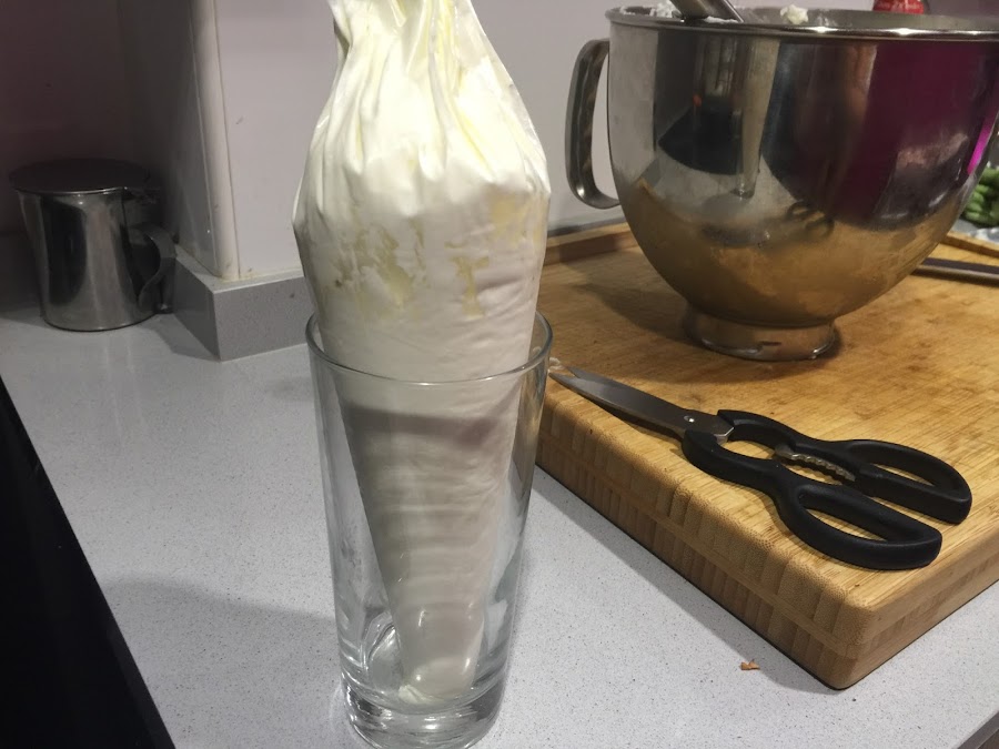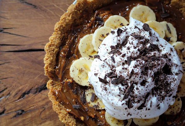 4. Montamos la nata (crema de leche), debe estar bien fría, con una cucharada de azúcar moreno. Ponemos la nata (crema de leche) en una manga pastelera y la colocamos en el centro de la tarta, dejando a la vista una fila de rodajas de plátano.