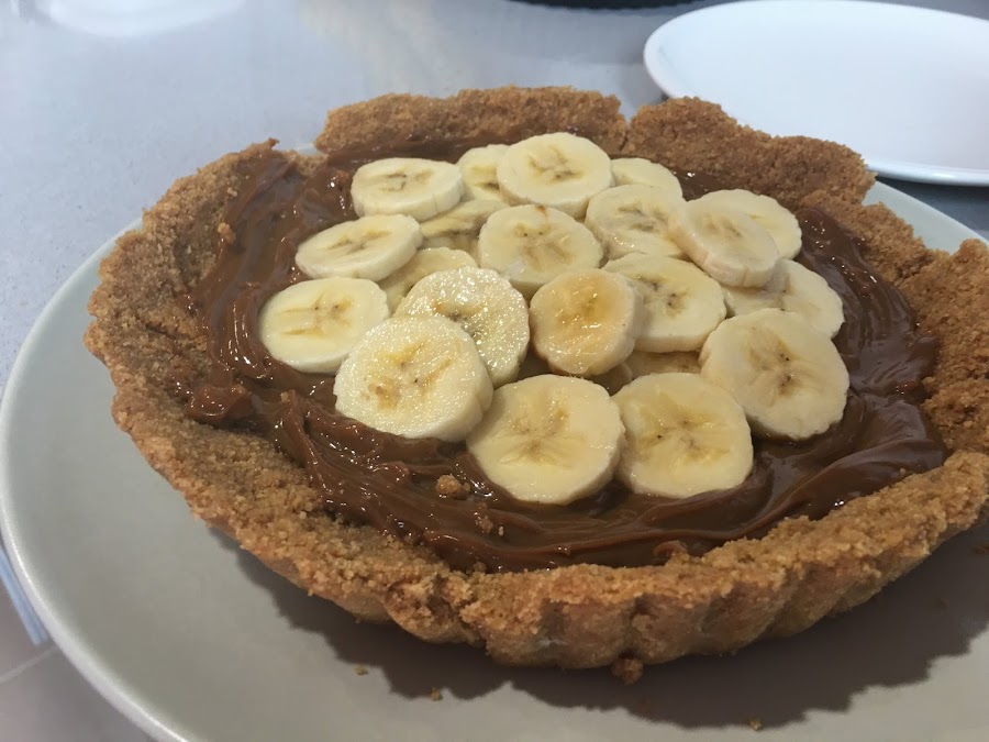 3. Sobre el dulce de leche ponemos las rodajas de plátano. Como véis he dejado un margen de dulce le leche libre para que una vez acabada la tarta se aprecien bien todos los ingredientes.
