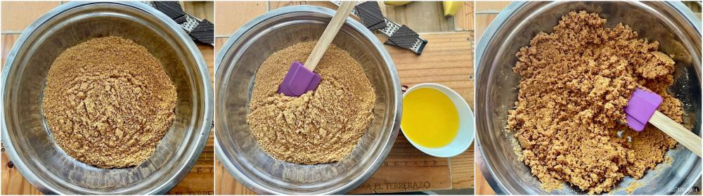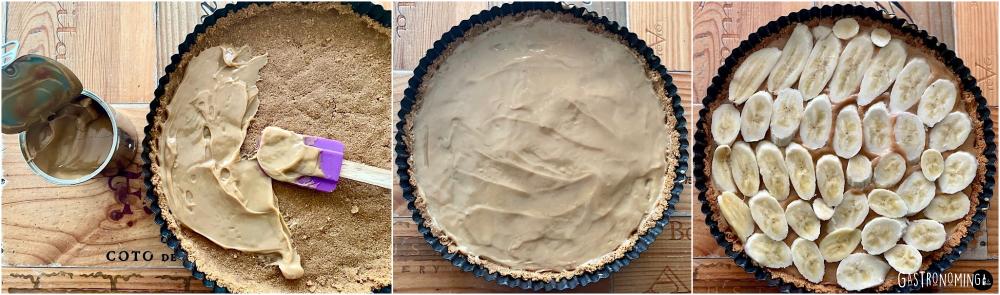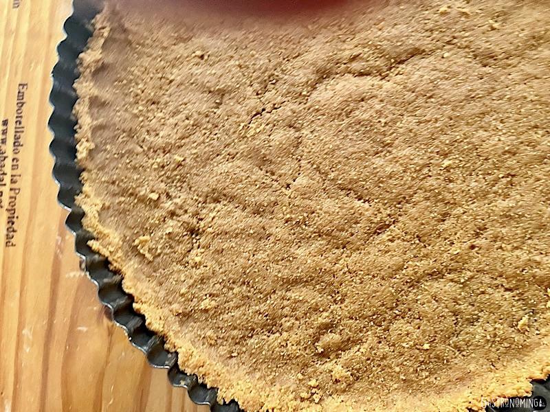 1. Lo primero, para hacer el dulce de leche, ponemos una lata de leche condensada en una olla a presión con agua suficiente para cubrir la lata un palmo, llevamos a hervir, tapamos y dejamos cocinando una hora a fuego bajo, pasado el tiempo, retiramos del fuego y dejamos enfriar para poder abrir la olla y posteriormente dejamos enfriar bien la lata antes de abrir (esto lo puedes hacer con días de antelación).*2. Ahora, con las galletas trituradas, bien en un procesador de alimentos o machacadas a mano con un rodillo, en mortero o como quieras, la mezclamos con la mantequilla derretida, mezclamos bien y formamos la base de la tarta con un borde de medio centímetro aproximadamente. Aplastamos bien con ayuda de una tasa, vaso o tus propias manos, para que esté firme y reservamos en frío al menos 1 hora.