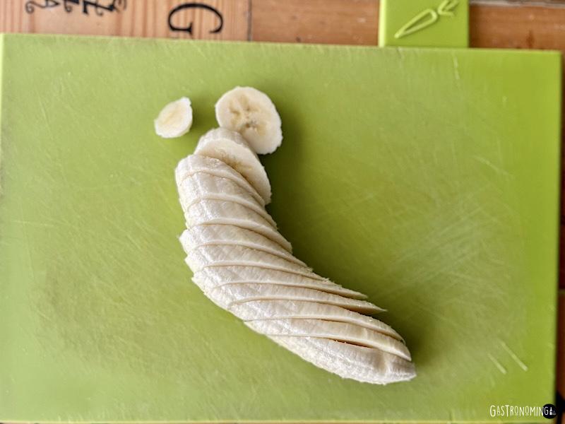 4. Ahora vamos introduciendo las rodajas de banana en el dulce de leche de manera uniforme y las aplastamos un poquito para que se hundan levemente.